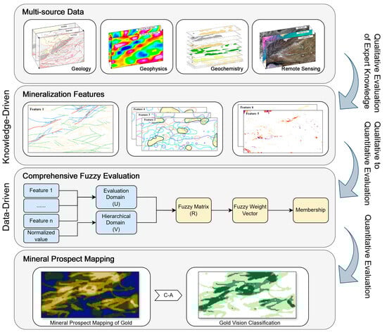 With advancements in exploration data integration methods and the deeper application of expert knowledge, resolving these challenges has become more feasible. By combining knowledge-driven and data-driven approaches, expert insights are effectively utilized alongside the objectivity of data analysis, thereby improving the accuracy and reliability of predictions [22]. Specialist knowledge is essential for interpreting geological structures, analyzing ore-forming processes, and identifying mineralization patterns [23,24], which bolsters the interpretability and reliability of prospecting forecasts. Moreover, the scale and complexity of mineral deposits necessitate the use of large-scale, high-dimensional datasets for mineral prediction [25,26]. Data-driven models offer the objectivity and precision necessary for uncovering patterns and relationships within complex, non-linear multi-source data [26,27,28,29].