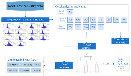 The workflow for extracting geochemical anomalies from relevant geochemical elements as follows (Figure 3):
