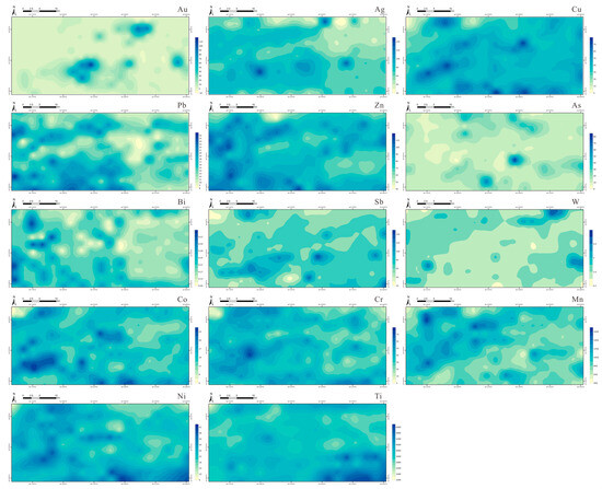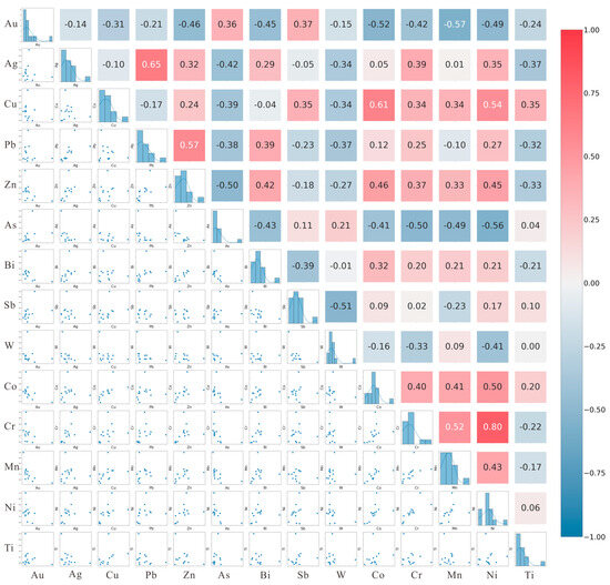 Based on the geological context of the study area, 15 elements were selected for geochemical anomaly extraction. The target element is Au, while the associated elements include Ag, Cu, Pb, Zn, As, Sb, Te, Bi, and W. Other elements include Cr, Ni, Co, Mn, and Ti. Statistical analysis indicates that the frequency distributions of these elements conform to a normal distribution (Table 1), making them suitable for geochemical anomaly extraction. After removing outliers from the dataset, Kriging interpolation was employed to estimate the concentrations of individual elements, resulting in geochemical anomaly maps for each component (Figure 5). The C-A fractal analysis method was used to determine the lower limits of anomalies for the elements (Table 2). Comprehensive anomaly information was extracted based on the correlation characteristics of mineralization elements. Correlation analysis (Figure 6), R-type cluster analysis, and factor analysis were conducted (Table 3). The correlation analysis revealed that Au has the highest correlation with Sb, followed closely by As. Cu and Co showed the strongest correlation among the base metals, with Ni following closely. Cr showed the highest correlation with Ni, followed by Mn. Ag was most strongly correlated with Pb.