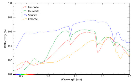 Spectral curves of iron-stained and hydroxylated minerals.