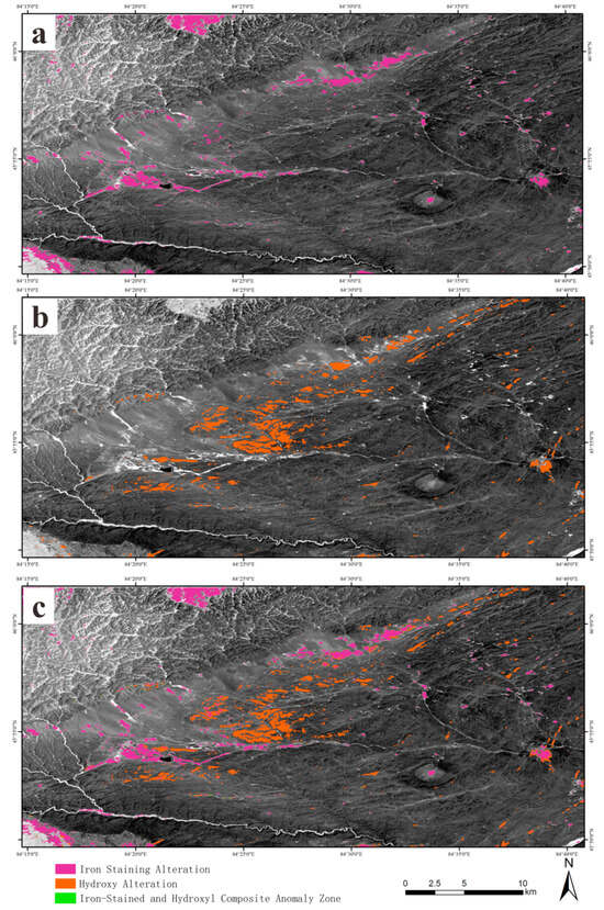 Results of alteration anomaly information extraction. (a) Iron staining alteration anomaly information; (b) hydroxyl alteration anomaly information; (c) superimposed results of iron staining and hydroxyl anomalies.