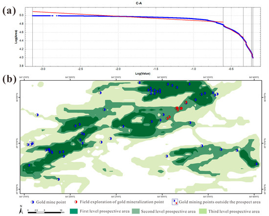 Double-logarithmic plot of the C-A method (a) and a grading map of mineralization prospects based on C-A method (b).