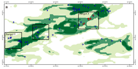 The extraction and classification information for iron staining and hydroxyl alteration, along with their respective anomaly classifications, are illustrated in Figure 8. The results of alteration anomaly extraction indicate that iron staining anomalies predominantly orient northeast (NE) and east–west (EW), aligning with the structural trends in the region. The anomalies exhibit banded and patchy distributions, with banded iron staining anomalies significantly influenced by the major faults in the area. These anomalies are located near the Anqi and Hatu faults, with more muscular iron staining anomalies corresponding to the intersections of these faults. Therefore, the iron-stained areas, especially those near the major faults, are identified as enrichment zones for hydrothermal gold deposits.