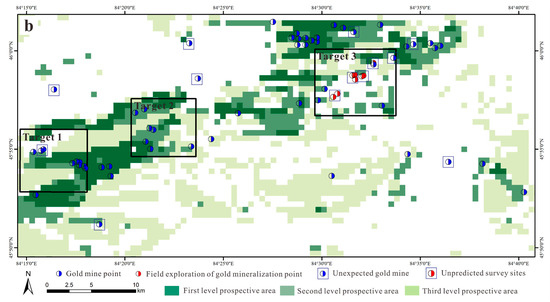 The known gold mineralization and field measurement points were superimposed on the mineral prediction map, revealing that all field measurement points fall within the second-level prospectivity zone. Among the 56 known gold mineralization belts, 54 are located within the exploration area, while 2 are outside the predicted area. Specifically, there are 32 gold mineralization belts in the first-level prospectivity zone, 14 in the second-level zone, and 8 in the third-level zone (Figure 9).