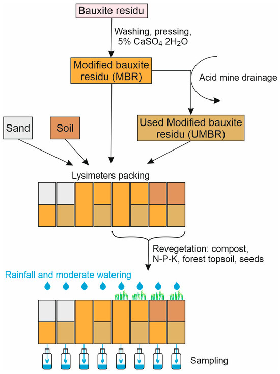 All chemical reagents were provided by VWR-advantor company (Rosny-sous-Bois, France) at analytical purity. An experimental flow diagram is given in Figure 1. Bauxaline® from ALTEO (Gardanne, France) is bauxite residue washed and partially dried in a filter press. The MBR used in the present study is Bauxaline® treated with atmospheric CO2, to which 5% gypsum was added in order to reduce the pH to 8.5 with precipitation of CaCO3. Soluble Na2SO4 remained. The MBR has a variable composition depending on the ore. Table 1 gives the usual range of major and potentially toxic elements in the Bauxaline and the values for the MBR used in this study, which are for most metal and metalloids above the limits for admission to inert waste storage facilities (IWSF) or non-hazardous waste storage facilities (NHWSF) [29]. The UMBR used in this study is the MBR described above, which was used to bind contaminants from acid mine drainage rich in As, Pb, Cd, Cr and Zn [30].