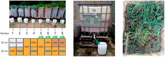 Eight 40-L lysimeters (hand-made from large plastic containers) were employed in this study, with varying content, including MBR, UMBR, silicate sand, and soil, with a total thickness of around 44 cm, as depicted in Figure 2. Lysimeters #1 to #4 remained unvegetated, while lysimeters #5 to #8 underwent a revegetation process. Additionally, a larger 700-L lysimeter (#16) filled with 66 cm (1087 kg) of MBR was subjected to the same revegetation process, aiming to more accurately simulate real MBR storage conditions (Figure 1). This last lysimeter was started a year after the others. To ensure technical and financial feasibility, we prioritized the collection of dense time series data over an extended period, without repetition. Repetition would have necessitated either sparse time series data or a shorter experimental duration. In this context, the consistency in the evolution of various variables over time ensures the validity of the results. Additionally, the comparison of the nine lysimeters further reinforces the robustness of the findings.