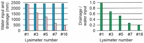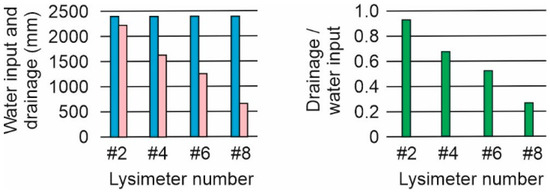 The drainage/water input ratio (Figure 10) as well as the cumulated L/S ratio (Table 3) for lysimeters #2, #4, #6, and #8 were almost identical to those observed for lysimeters #1, #3, #5, and #7, respectively, leading to the same observation as for the latter lysimeters: sand capping limited evaporation, revegetation increased evaporation and reduced drainage, soil capping improved water storage or evapotranspiration.