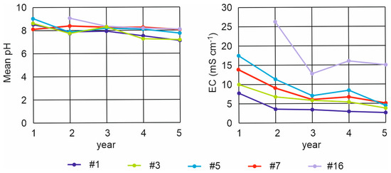 Leachates contain high concentrations of Na that could cause the clay to disperse into the material underlying the spreading, leading to clogging of the porosity and making it impermeable [33,37]. The consequence would be the clogging of the spread materials and, therefore, a risk of death of vegetation, surface erosion by runoff and modification of the Eh conditions and, therefore, of the mobility of elements likely to change their oxidation state. SAR and EC values for the first and final years of the experiment are given in Figure 8. All points are plotted in the area, indicating no clay dispersion problems. All leachates, however, remained strongly saline with regard to plant growth.