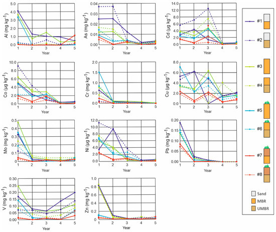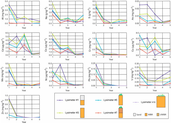 Figure 12 shows the temporal variation of the annual leaching per kg of MBR or MBR+UMBR of potentially toxic metals or metalloids. Data for all analyzed elements are provided in the Supplementary Materials Section. In lysimeters with UMBR, the behavior of the elements is similar to that observed in lysimeters without UMBR, with leaching decreasing over time to reach very low values in the fifth year, with the exception of vanadium, as previously commented.