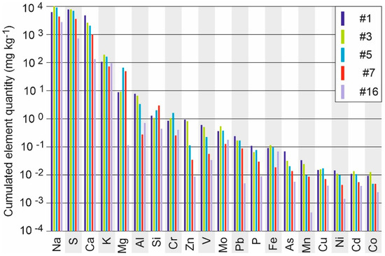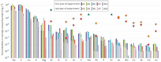 Figure 5 gives the temporal variation of the annual leaching per kg of MBR of the elements most likely to pose environmental hazards, such as Na and S, due to salinity or sulfation issues for plants and soils, as well as potentially toxic metals or metalloids. Data for all analyzed elements are provided in the Supplementary Materials Section. Figure 6 presents the cumulative leaching from each lysimeter for all analyzed elements over the entire experimental period (5 years for lysimeters #1 to #7 and 4 years for lysimeter #16).