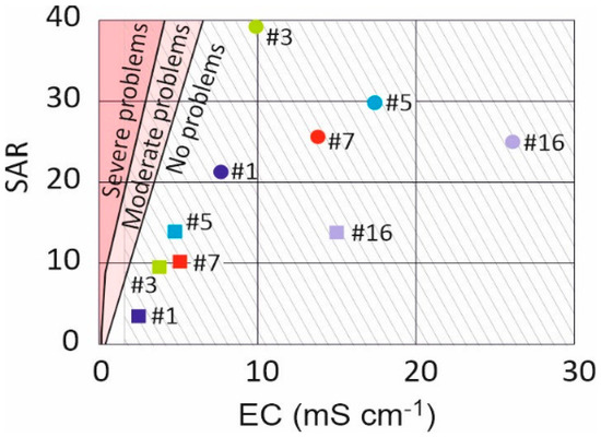SAR and electrical conductivity (EC) of lysimeters #1, #3, #5, #7 and #16. Circles and squares give first and final-year values, respectively. Areas related to clay dispersion problems were drawn after Hanson et al. [38]. Hatched area represents high and very high salinity with regard to plant growth [39].
