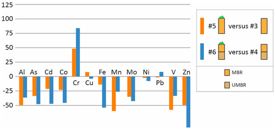 The impact of revegetation on element leaching was evaluated by comparing lysimeters #5 versus #3 (solely MBR) and #6 versus #4 (MBR over UMBR) (Figure 9). Overall, revegetation led to a decrease in leaching of most metals or metalloids investigated, except for Cr in both MBR-only and MBR/UMBR lysimeters, as well as to a small extent Cu in MBR-only lysimeter and Pb in MBR/UMBR lysimeter.