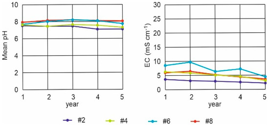 pH and electrical conductivity (EC) of lysimeters #2, #4, #6 and #8.