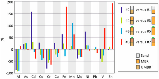 Figure 13 illustrates the variation in cumulative leaching between lysimeters with and without UMBR. There was no clear trend in the difference in leaching between lysimeters with and without UMBR. The presence of UMBR led to varying retention and leaching patterns for different elements: some elements, such as Al, Cr, and Mo, were more retained, while others, like As, Mn, and Ni, were more emitted. Additionally, the retention or leaching of certain elements varied depending on the lysimeter design: sand capping increased leaching for Cd, Co, Cu, Fe, and Ni, whereas soil capping led to higher leaching for Fe, Mn, V, and Zn. Interestingly, despite the higher As, Pb, Cr, and Zn contents in UMBR, lysimeters with UMBR did not consistently show higher leaching for these elements throughout the experiment. This indicates the effectiveness of UMBR in retaining these elements.