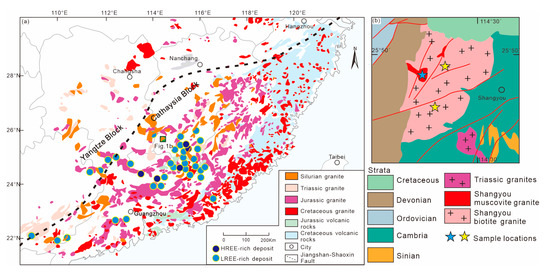 (a) The distributions of granitoids and ion-adsorbing REE deposits in South China [3,30]; (b) Simplified geological map of the Shangyou pluton.
