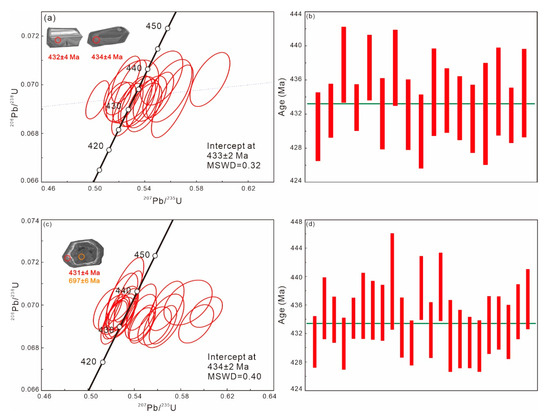 Zircon U-Pb isotopic data are listed in Table S1 and illustrated in Figure 3. The zircon grains from the Shangyou biotite granite are colorless to light yellow, irregularly shaped crystals with lengths of 100–400 μm and length–width ratios of 1–3 (Figure 3a). The zircon grains show clear oscillatory zoning, indicative of magmatic zircons in granitic systems [35]. The 238U/206Pb ages for the zircons are between 430 and 438 Ma with a weighted age of 433 ± 2 Ma, which is consistent with the concordia age of 433 ± 2 Ma (Figure 3b), taken as the intruded age of the Shangyou biotite granite.