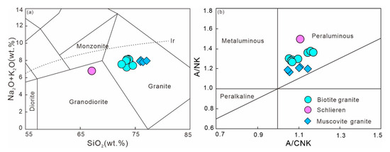 (a) TAS [36] and (b) A/CNK vs. A/NK [37] diagrams for the Shangyou biotite granite and muscovite monzogranite.
