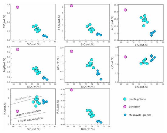 Harker diagrams for the Shangyou biotite granite and muscovite monzogranite.