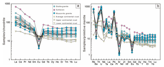 Chondrite-normalized REE patterns (a) and primitive mantle-normalized trace element patterns (b) for the Shangyou biotite granite and muscovite monzogranite. Chondrite and primitive mantle data from Sun et al. (1989) [38].