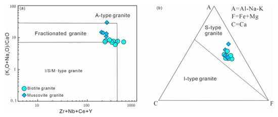 Zr + Nb + Ce + Y vs. K2O + Na2O)/CaO [40] (a) and ACF classification [40] (b) diagrams of the Shangyou biotite granite and muscovite monzogranite.