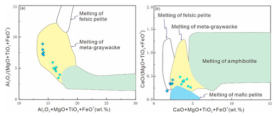 Discrimination diagrams of source region of (a) Al2O3 + MgO + TiO2 + FeOT vs. Al2O3/(MgO + TiO2 + FeOT), and (b) CaO + MgO + TiO2 + FeOT vs. CaO/(MgO + TiO2 + FeOT) for Shangyou biotite granite and muscovite monzogranite (after Douce, 1999 [49]).