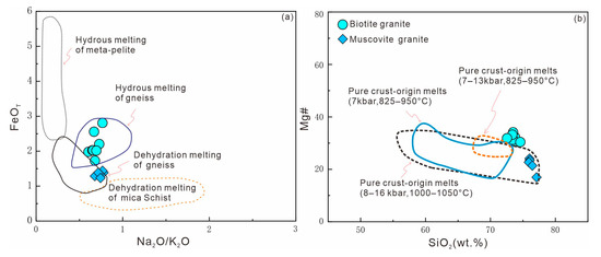 (a) Na2O/K2O vs. FeOT [61] and (b) SiO2 vs. Mg# [62] diagrams for Shangyou biotite granite and muscovite monzogranite.