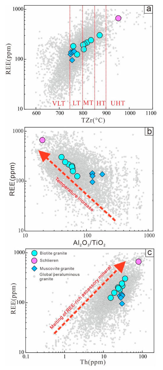 TZr (a), Al2O3/TiO2 (b), and Th (c) vs. REE plots of the Shangyou biotite granite and muscovite monzogranite and peraluminous granitoids from worldwide. The data for global peraluminous granitoids are from Georoc: “http://georoc.mpch-mainz.gwdg.de/georoc (accessed on 12 June 2024)”.