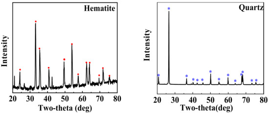The high-purity samples of hematite and quartz were purchased from Ye Mineral Company, Guangzhou, China, and their 38–74 μm particles were prepared sequentially by crushing, grinding, and sieving. The results of their X-ray diffraction (XRD) and X-ray fluorescence (XRF) are shown in Figure 1 and Table 1, respectively, indicating a high purity.