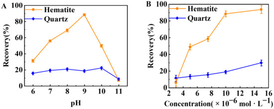 Effect of (A) pH (1 × 10−5 mol·L−1 TBC) and (B) the initial TBC concentration (pH ~9.0) on the flotation recovery of hematite and quartz.