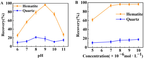 The flotation performances of TBC were further investigated by artificially mixed minerals. Figure 4 shows the flotation recovery of hematite and quartz from their artificially mixed minerals as a function of pH and the initial TBC concentration. Figure 4A indicates that with rising pH, the flotation recovery of hematite increased and reached 96.31% at pH 9.0, and then decreased. Meanwhile, the recovery of quartz remained below 22% at pH 6.0–11.0. Figure 4B shows that as the initial TBC concentration increased from 5 × 10−6 to 1 × 10−5 mol·L−1, the recovery of hematite increased from 61.52% to 98.31%, while the recovery of quartz only increased from 10.23% to 17.61%. Therefore, TBC was an efficient collector for the flotation separation of hematite from quartz.