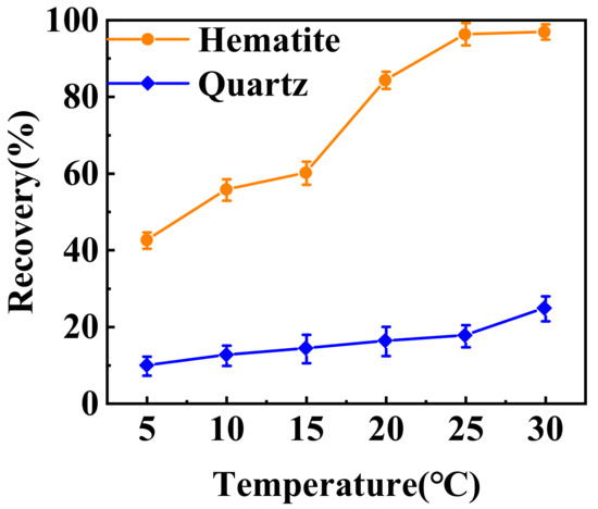 The effect of temperature on the flotation recovery of hematite and quartz from their mixture by TBC was further investigated. Figure 5 shows that as the temperature increased from 5 to 30 °C, the recovery of hematite rose from 42.54% to 96.92%, while the recovery of quartz only increased from 9.78% to 24.74%. At 20 °C, the recoveries of hematite and quartz were 84.31% and 16.22%, respectively. This meant that the favorable temperature for TBC flotation separation of hematite and quartz was above 20 °C. The flotation temperature of sodium oleate is generally higher than 35 °C [14], so TBC has stronger temperature applicability than sodium oleate.