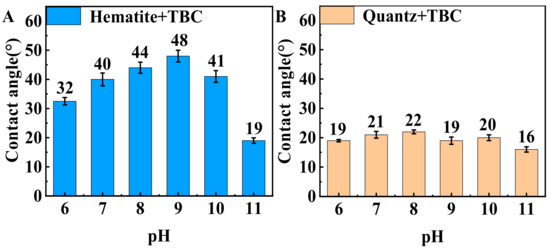 The contact angle of the (A) TBC-treated hematite and (B) TBC-treated quartz as a function of pH (1.0 × 10−5 mol·L−1 TBC).