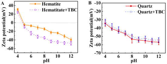 Figure 7 shows the effect of pH on the zeta potential of quartz and hematite with or without TBC. As shown in Figure 7A, the isoelectric point (IEP) of hematite was observed near pH ~5.0, which was consistent with the reported value [51]. In the presence of TBC, the zeta potential of hematite particles decreased, especially under pH > 6.0, inferring an adsorption of TBC on the surface of hematite.