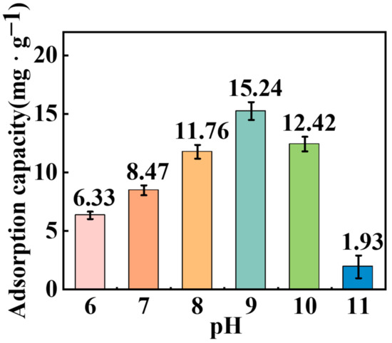 The adsorption capacity of TBC on the surface of hematite under different pH values is shown in Figure 8, which indicates that as the pH increased from 6.0 to 9.0, the adsorption capacity of TBC on hematite increased from 6.33 to 15.24 mg·g−1; subsequently, with pH increasing to 10.0 and 11.0, the adsorption capacity of TBC decreased to 12.44 and 1.93 mg·g−1, respectively. The results revealed that the preferable pH value for TBC adsorption onto the hematite surface appeared at 8.0–10.0, being in agreement with the flotation and contact angle findings.