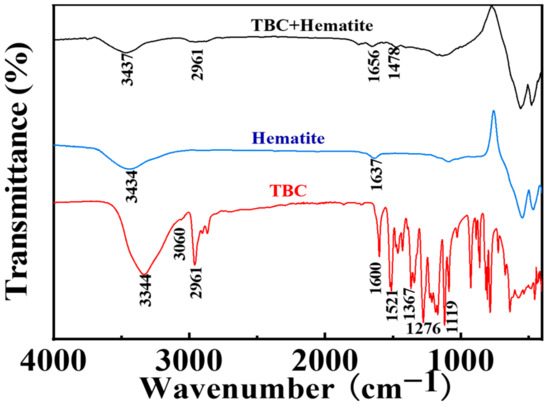 The FTIR spectra of TBC, hematite, and TBC-treated hematite are listed in Figure 9. For TBC, the peaks at 3060 and 2961 cm−1 corresponded to the C-H stretching vibrations of the benzene ring and methyl groups [52], respectively. The C=C vibrations of the benzene ring appeared at 1600 and 1521 cm−1, the hydroxyl (-OH) peaks emerged at 3344, 1367, and 1119 cm−1 [53], and the C-C vibrations of the tert-butyl group appeared at 1276 cm−1. After the interaction of TBC with hematite, the new peaks at 1478 and 2961 cm−1 appeared on the surface of hematite, which were assigned to the C=C vibrations of the benzene ring and the C-H vibrations of the methyl group, respectively. The FTIR spectroscopy results suggested the adsorption of TBC on the hematite surface.