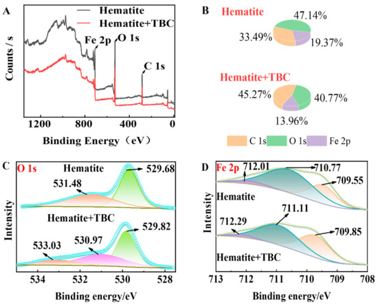 Figure 10D demonstrates that the Fe 2p3/2 XPS spectra of pure hematite were divided into three peaks at ~712.01, 710.77, and 709.55 eV, which were assigned to Fe(III), Fe(III), and Fe(II) adsorption bands, respectively [56,57,58]. After TBC treatment, the three Fe 2p3/2 XPS peaks all shifted to the higher binding energies of ~712.29, 711.11, and 709.85 eV [59], and the proportion of adsorption bands at 709.85 eV increased significantly. These results implied that TBC chemisorbed on the hematite surface, accompanied by the reduction of some Fe(III) into Fe(II).