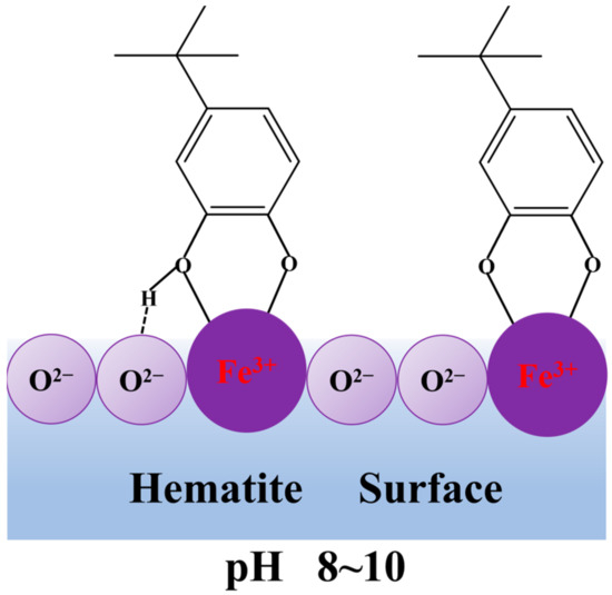 Based on the above experimental results and analyses, a possible adsorption model of TBC on the hematite surface at pH ~9.0 was suggested and shown in Figure 11. It demonstrated that TBC’s two O atoms bonded with the surface Fe atom(s) of hematite to form the five-membered chelating ring, while the H atom of TBC’s hydroxyl formed an H-bond with the O atom of the hematite surface.