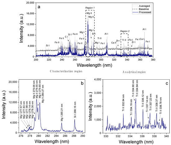 Representative pre-processed LIBS spectra acquired from veinlet a at position #1a (a). Enlarged spectral regions of Mg I–II and Si I lines used for plasma characterization (b), and Ti I–II lines used for compositional analysis (c). Selected analytical lines are labeled with an arrow.