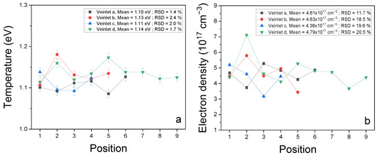 Temperature (a) and electron density (b) values calculated for the laser-induced plasma along the veinlets analyzed at different positions. The mean values and relative standard deviations (RSD) are shown for each veinlet.