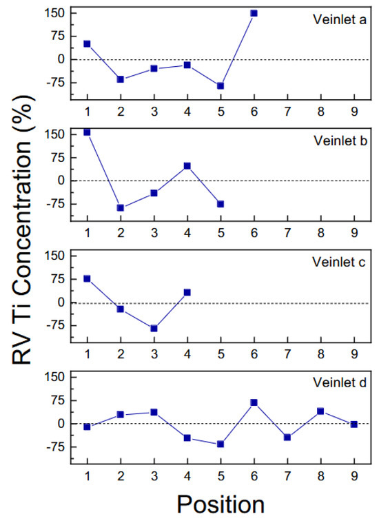 Relative variations (%) of Ti concentration along the analyzed veinlets at different positions.