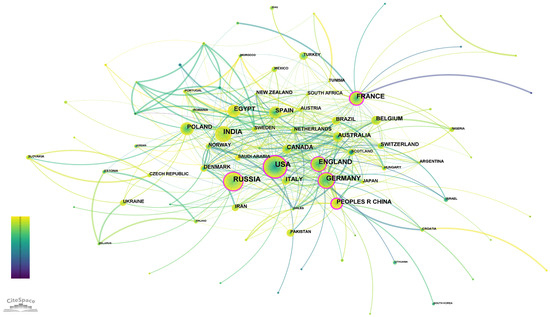 Using CiteSpace to analyze the co-occurrence of countries/regions helps to understand the co-occurrence relationship between different countries/regions in a specific research field. Figure 2 shows the country/region cooperation network in the field of glauconite, and Table 1 lists the top 10 countries/regions in terms of publication volume. The distribution of research output in countries/regions is uneven, and the publication volume of major countries accounts for a considerable proportion. As can be seen from Figure 2 and Table 1, the country with the most publications is the United States (227 articles), followed by Russia (167 articles), India (146 articles), France (123 articles), England (120 articles), Germany (112 articles), Egypt (87 articles), Canada (82 articles), Italy (70 articles), and China (66 articles). The centrality of the United States (0.38), France (0.34), China (0.21), Germany (0.17), Russia (0.15), England (0.13), and Italy (0.10) is no less than 0.1, playing a supporting role in the network structure and indicating that the research results of these countries have a high global influence.