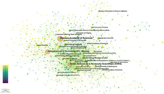 The number of papers is the basis for measuring the academic influence of an institution, and the quality of papers is the key to improving the academic influence of an institution [30]. Figure 3 depicts the institutional cooperation network in the field of glauconite, and Table 2 lists the top 10 institutions in terms of the number of papers published. Among the top 10 institutions, 3 are from Russia, and 1 each is from France, India, England, Poland, Belgium, the United States, and Canada. Among them, the Russian Academy of Sciences (110 articles, 0.22) ranked first in terms of the number of papers published, with its main research direction being the chemical composition and structural characteristics of glauconite; followed by the Centre National de la Recherche Scientifique (78 articles, 0.36), the Indian Institute of Technology-Bombay (61 articles, 0.18), the Geological Institute (47 articles, 0.02), the Natural History Museum London (28 articles, 0.06), the Polish Academy of Sciences (24 articles, 0.10), KU Leuven (24 articles, 0.04), the United States Geological Survey (23 articles, 0.02), Tomsk Polytechnic University (21 articles, 0.02), and University of Calgary (19 articles, 0.02). In summary, the Russian Academy of Sciences, the Centre National de la Recherche Scientifique, and the Indian Institute of Technology-Bombay have a significant advantage in the output of academic achievements in this field, and their output is of high quality.