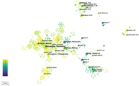 Author analysis can reflect the cooperation relationship between different authors in a certain research field and identify researchers with high influence in the research field. Figure 4 shows the co-occurrence analysis of authors in the field of glauconite, and Table 3 shows the top 10 authors in terms of the number of publications. Among the top 10 authors, Russia accounts for 5, India accounts for 2, and Italy, Germany and Belgium each account for 1. The researcher with the most papers is Santanu Banerjee (39 articles), whose main research directions are the origin, evolution, and chemical composition of glauconite; followed by Victor A. Drits (23 articles), T. A. Ivanovskaya (19 articles), Maxim Rudmin (17 articles), T. S. Zaitseva (16 articles), Alessandro Amorosi (12 articles), Tathagata Roy Choudhury (12 articles), Markus Wilmsen (12 articles), B. A. Sakharov (11 articles), Jef Deckers (9 articles). As can be seen from Figure 4, there is a wide range of cooperative relationships between the authors, and a large scientific research cooperation network has been formed with Santanu Banerjee, Victor A. Drits, Maxim Rudmin, Alessandro Amorosi, Tathagata Roy Choudhury, and Markus Wilmsen as the main researchers. Some of the research was completed in small groups. It should be noted that the data for this analysis are based on the WOS core database, and the lack of field information for books cannot be included, such as the important publications published by Odin [31,32], who laid the foundation for subsequent research.