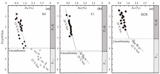 The ELIP had a significant impact on the thermal history of the Sichuan Basin, primarily through elevated paleothermal flow and increased paleogeothermal gradients. Notably, during the Late Permian, paleothermal flow in the basin peaked, with heat flow values reaching as high as 124 mW/m2 in certain areas. This intense thermal activity played a crucial role in the hydrocarbon generation and maturation processes within the basin [41]. This thermal anomaly closely coincides with the period of activity of the Emeishan mantle plume, suggesting a likely correlation between the anomaly and the ELIP. The elevated heat flow during this period also raised paleothermal indicators, such as vitrinite reflectance (Ro), a widely recognized and extensively used maturity index in hydrocarbon basins, which is crucial for reconstructing thermal histories [40]. Data from boreholes in the Sichuan Basin reveal a notable inflection in vitrinite reflectance (Ro) between the Middle and Upper Permian strata, indicating significant variations in paleothermal regimes. For example, in borehole NJ in central Sichuan, the geothermal gradient shifts from 19 °C/km above the unconformity to 22 °C/km below it. Similarly, in the Y1 well, the gradient increases from 20 °C/km above the unconformity to 29 °C/km below. In the fault-active region of eastern Sichuan, the JS28 well shows a shift from 20 °C/km above the unconformity to 42 °C/km below (Figure 2).