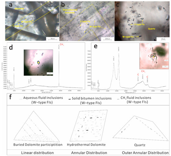 Characteristics of inclusions in the Zdn4 Formation of the GS6 well, (a) Fluid inclusions distributed along fractures in burial dolomite; (b) fluid inclusions located along mineral growth zones in hydrothermal dolomite; (c) fluid inclusions developed in the growth rims of quartz crystals; (d,e) Laser Raman spectra of CH₄ (methane) inclusions; (f) schematic diagram of the spatial distribution of fluid inclusions.