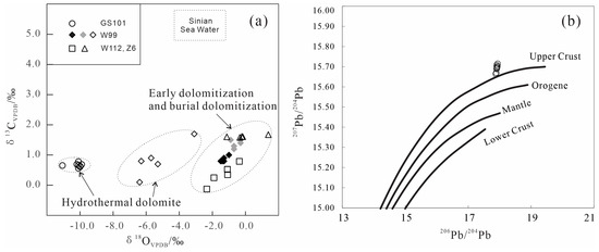 (a) C and O isotopic compositions of the different types of dolomites in Sichuan Basin (GS101 well (this study); W99 well [52]; W112 and Z6 wells [53]); (b) plot of 207Pb/204Pb vs. 206Pb/204Pb plot of sulfide in the Zdn4 Formation (5517.5 m) of the GS101 well (Pb evolution curves of upper crust, orogene, mantle, and lower crust after [54]).