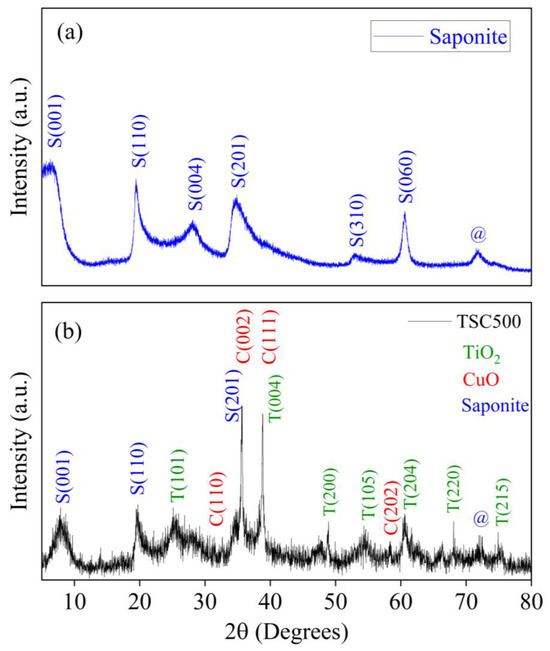 XRD pattern: (a) raw saponite and (b) CuO-TiO2–saponite nanocomposite obtained by hydrothermal synthesis.