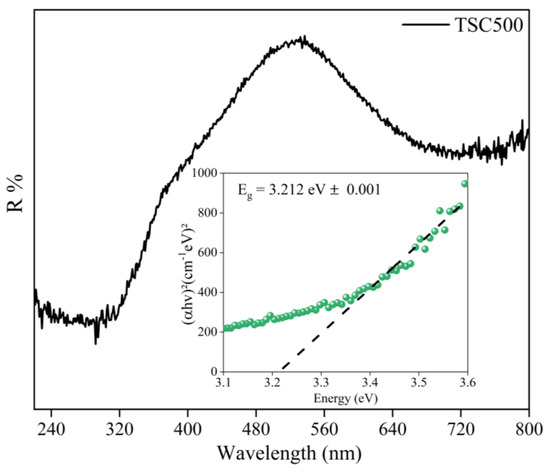 UV–Vis DRS spectrum and the optical band gap for the CuO-TiO2–saponite nanocomposite. The insert represents the band gap calculation using Tauc’s relation.