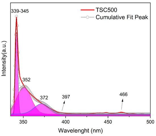 On the other hand, a photoluminescence (PL) study was conducted to investigate the structural defects and the nature of electron–hole recombination in the nanocomposite (Figure 5). This technique is valuable in photocatalysis for assessing the separation efficiency of electrons and holes. The synthesized TiO2-based nanocomposite displays both near-band emission (NBE) and deep-level emission (DLE). The DLE is attributed to various intrinsic structural defects within the TiO2 lattice [38]. The PL spectrum shows an intense peak in the range of 339–345 nm, corresponding to the band luminescence of the material attributed to self-trapped excitons, oxygen vacancies, and surface states. Additionally, peaks at 352 nm, 372 nm, and 397 nm are associated with recombination or sub-band gaps caused by oxygen vacancies. The exciton emission corresponding to 466 nm is linked to surface oxygen vacancies, occurring when the charge of Ti3+ is transferred to the oxygen vacancy in the TiO68− octahedral [29,39]. These defects could result from the combination of compounds in the ternary nanocomposite. Additionally, these defects may reduce electron–hole pair recombination, favoring charge separation and thereby improving the material’s photocatalytic potential [40,41,42,43].