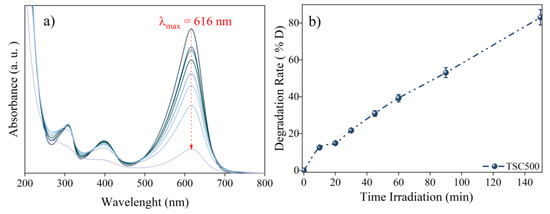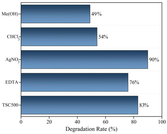 The photocatalytic activity of the TSC500 nanocomposite was evaluated by degrading bromocresol green dye under UV irradiation for 150 min, as shown in Figure 6a. The dye’s maximum absorption band at 616 nm decreased significantly during the irradiation process. Figure 6b illustrates that 83% degradation was achieved, demonstrating the nanocomposite’s high photocatalytic efficiency. On the other hand, scavenger tests were conducted to identify the primary reactive species involved in the dye photodegradation mechanism [44,45]. As shown in Figure 7, the silver nitrate (AgNO3) addition enhanced the photocatalytic capacity by 7%. Silver adsorbs onto the semiconductor surface and acts as an electron acceptor, improving the material’s photocatalytic performance, consistent with previous studies [46,47]. Interestingly, the presence of methyl alcohol (CH3OH) and chloroform (CHCl3) significantly reduced the photocatalytic activity, resulting in decolorization rates of 49% and 54%, respectively.